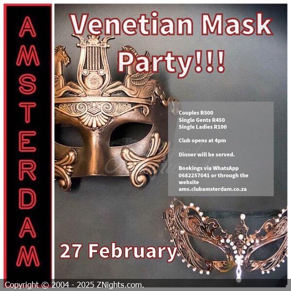 Hi Amsterdamers 🌺🌹. 🕺🏼💃. Bookings are open for this Saturday’s Venetian Mask Party 🎭 It’s a not-to-missed party and an opportunity to view the eye candy on display. DJ Luscious M will be spinning the tunes 🎧🎵👩🎤. Due to COVID-19 restrictions, spaces are limited. The club will open at 4 pm. Book via WhatsApp on 068 225 7041, Love Dee & Benton 💋💋