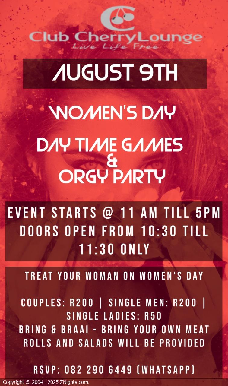 Women's Day Games and Orgy Daytime Party - We will have the braai ready and salad and rolls will be provided so you will just have to bring the meat you want to braai.