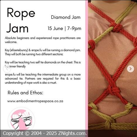 Absolute beginners and experienced rope practitioners are welcome. Rope Jams are spaces where you can come and practice rope tying in a peer-to-peer based setting. Singles, couples, throuples, etc are all welcome. Switching is allowed and encouraged.