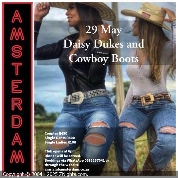 Hi Amsterdamers 🌺🌹🕺🏼💃. It’s that time of the month again; our month end party promises to be a blast with our Daisy Dukes and Cowboy Boots Party theme. So, lets get into those Daisy Dukes outfits and dance the night away. Limited spaces are available for this event. Best dressed prices and a complimentary sherry on arrival for the evening. DJ Nicholas will be spinning the tunes 🎧🎵👩🎤. Due to COVID-19 restrictions, spaces are limited. The club will open at 6pm. Book via WhatsApp on 068 225 7041. Love, Dee & Benton 💋💋