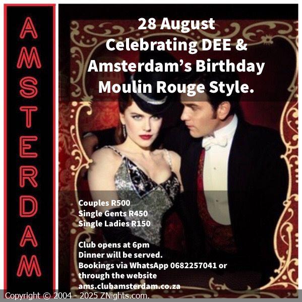 Hey Amsterdamers 🌺🌹🕺🏼💃. You are invited to join us for DEE & Amsterdam’s Birthday this Saturday Moulin Rouge Style. The club will be decorated accordingly. This is a sexy stylish theme so let’s see your creative juices flow. DJ Nic will be spinning the tunes 🎧. Due to Level 3 COVID-19 restrictions, spaces are limited. The club will open from 6pm. Book via WhatsApp on 068 225 7041 or on our website www.ams.clubamsterdam.co.za. Love, Dee 💋💋