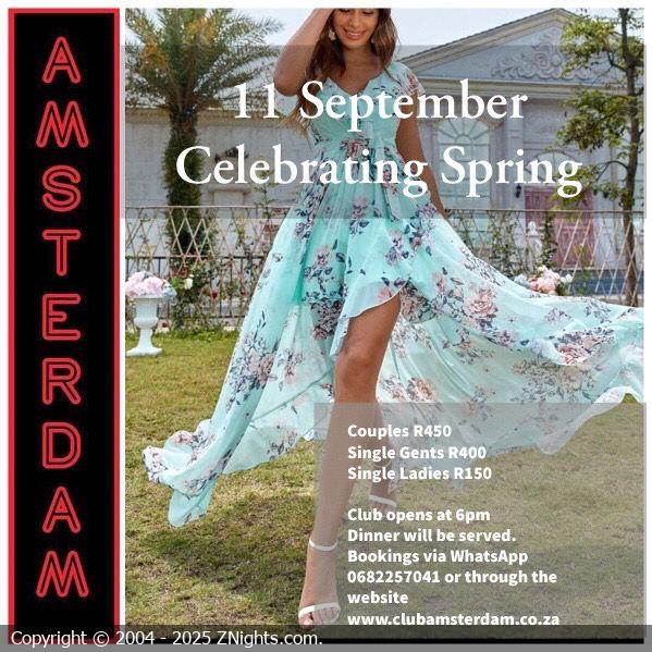 Hi Amsterdamers 🌺🌹🕺🏼💃. You are invited to join us for our Spring Party this Saturday. This is a casual but sexy theme so let’s see how creative you can be. DJ Nicolas will be spinning the tunes 🎧🎵👩🎤. Due to COVID-19 , spaces are limited to 50 guests also limited spaces are available for single gents. The club will open from 6pm. Book via WhatsApp on 068 225 7041 or on our website www.ams.clubamsterdam.co.za. Love, Dee 💋💋