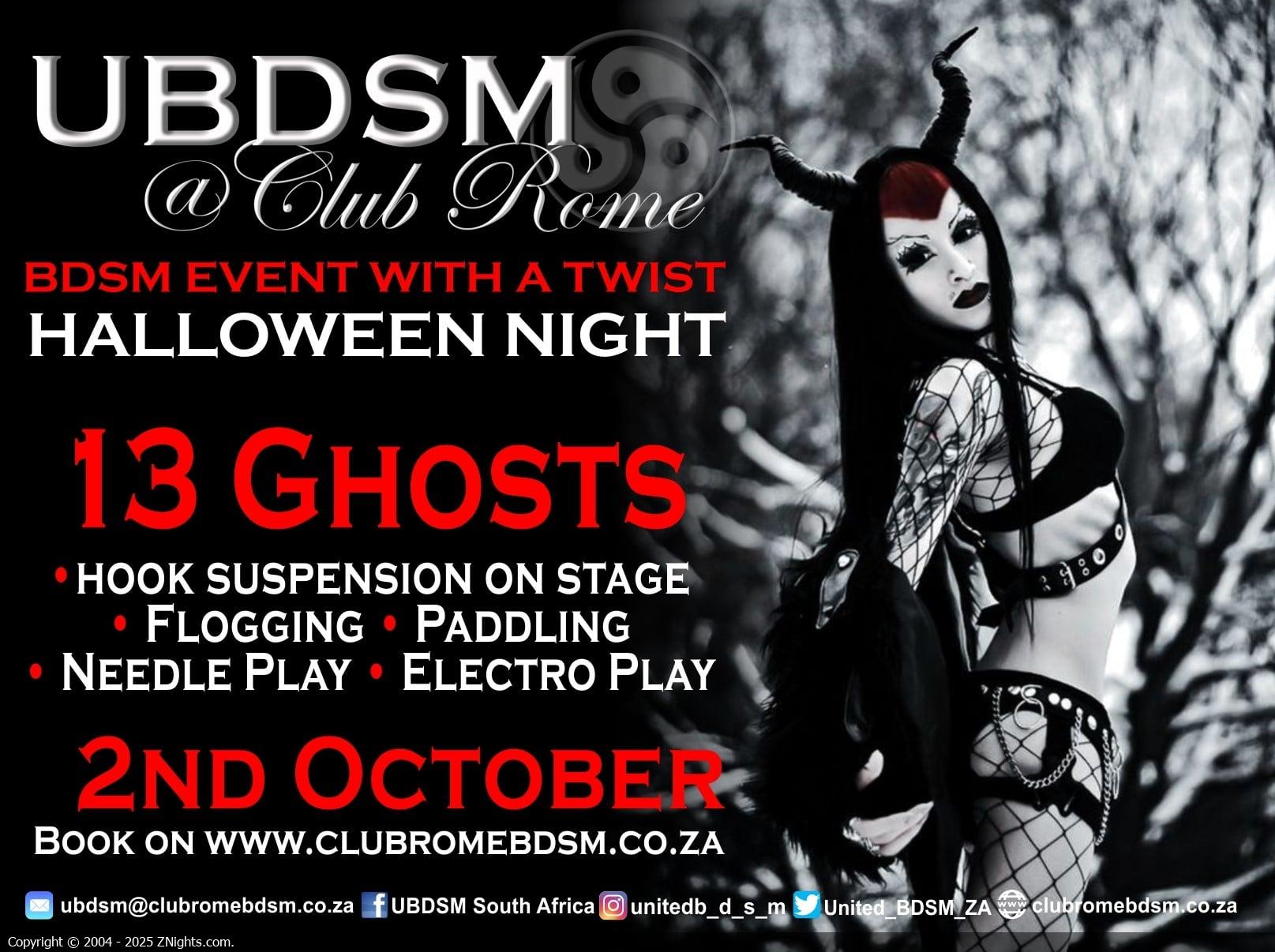 UBDSM @ Club Rome - BDSM Event with a Twist -13 Ghosts Halloween Night!! Wouldn't you like to see something strange? Come with us and you will see This, our town of Halloween This is Halloween, this is Halloween, Pumpkins scream in the dead of night!! HOOK SUSPENSION ON STAGE!