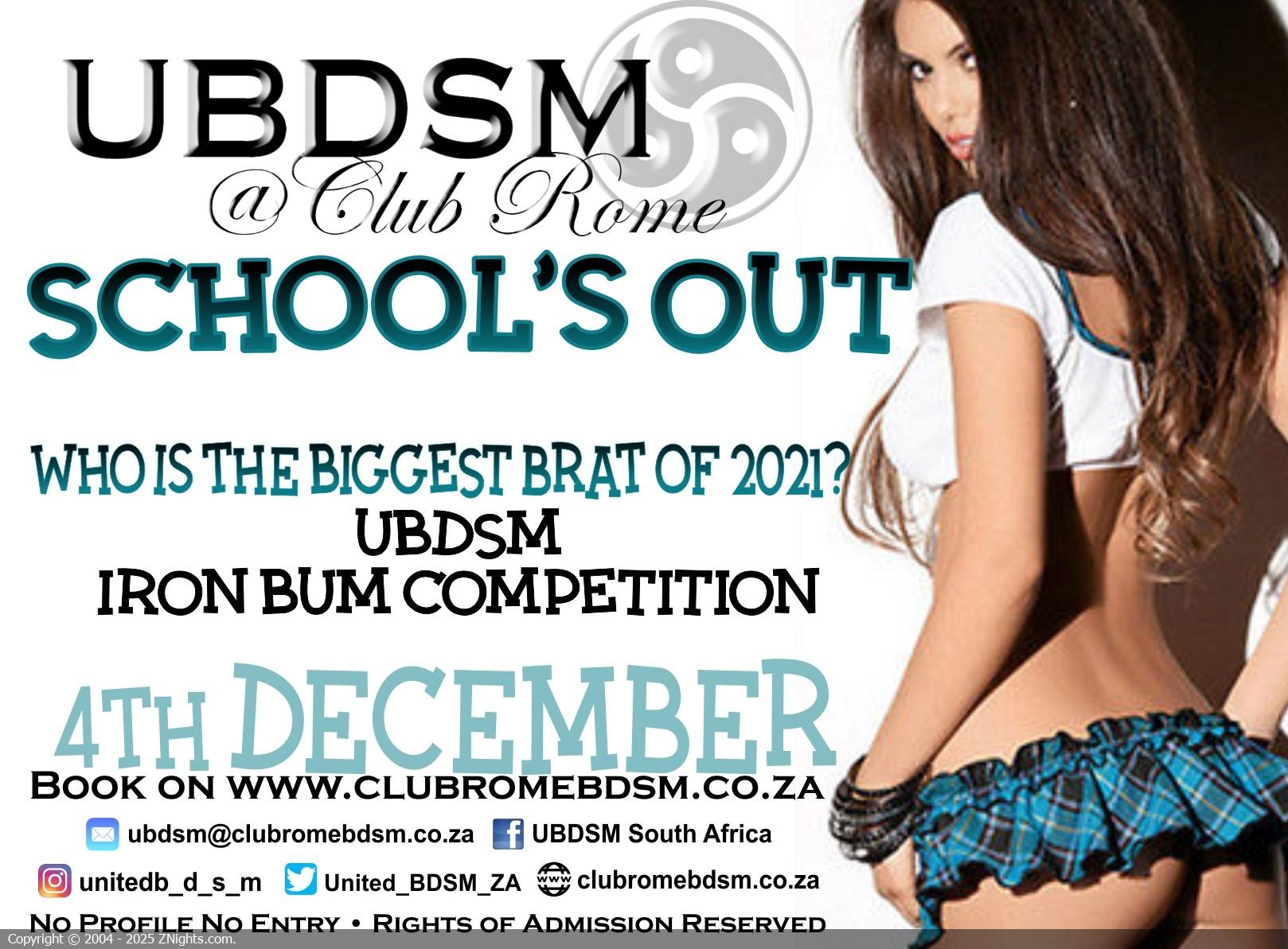 UBDSM @ Club Rome - 4th December SCHOOL'S OUT get those booty up in the air and enter Iron Bum Competition and who is the biggest brat of the year? Book Book on www.clubromebdsm.co.za