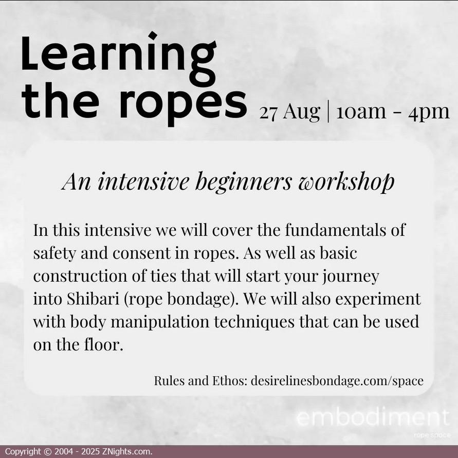 This is a technical rope workshop for people serious about nailing the basics. This class (or equivalent private tuition) is a pre-requisite for our other intermediate classes and non-beginner rope jams.
