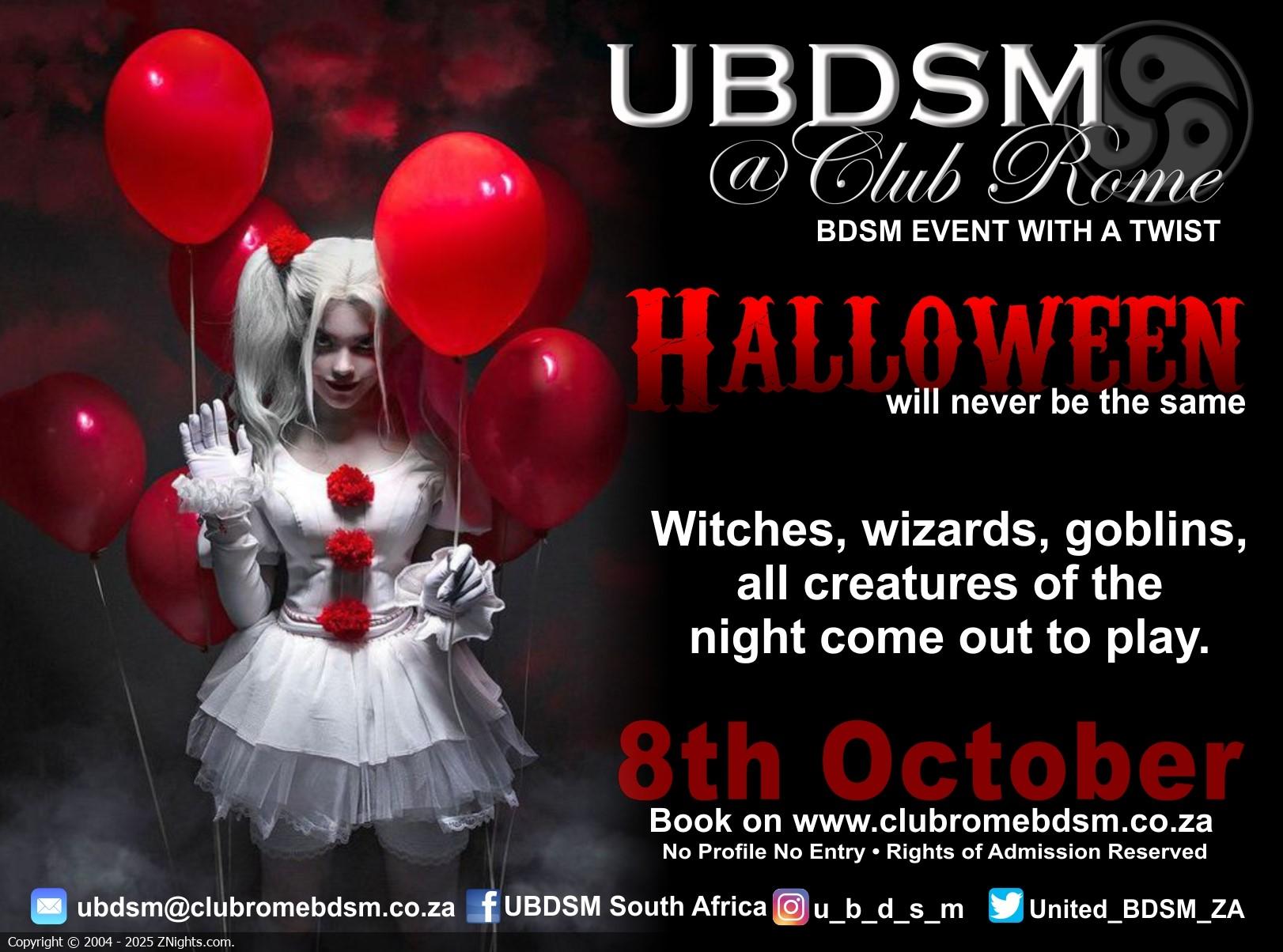 UBDSM at Club Rome- BDSM Event with a Twist! Halloween will never be the same. Witches, wizards, goblins, all creatures of the night come out to play.