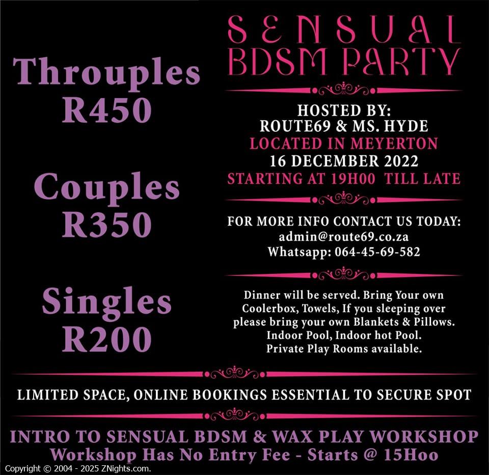 The party is from 19:00 till late. The party is open to all, however BDSM Party Etiquette applies.