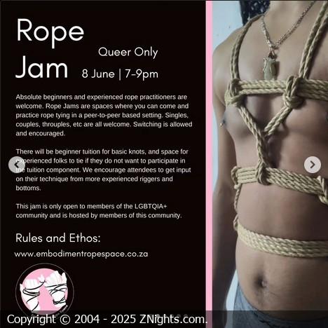 Absolute beginners and experienced rope practitioners are welcome. Rope Jams are spaces where you can come and practice rope tying in a peer-to-peer based setting. Singles, couples, throuples, etc are all welcome. Switching is allowed and encouraged.