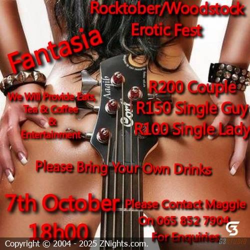 Hey Sexy Peeps, Cum and Join Us 4 A Naughty Evening of Rock Through The Ages and Woodstock partying the Night Away and Being Very Naughty 😜 R200 per couple R150 Per Single Guy and R100 For Single Ladies Please Contact Me 4 More Information 😜