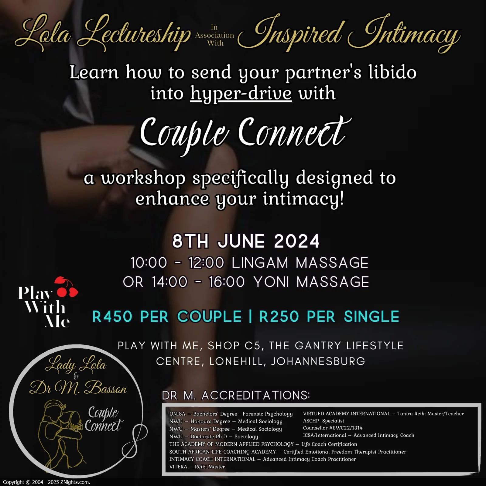 Couple Connect is BACK! Come & join Lola & Dr M for the extremely popular Couple Connect workshop on Yoni or Lingam on the 18th of May at Play With Me Fourways. Couple Connect's workshops were sold out during 2023 SexExpo and you do not want to miss this one!