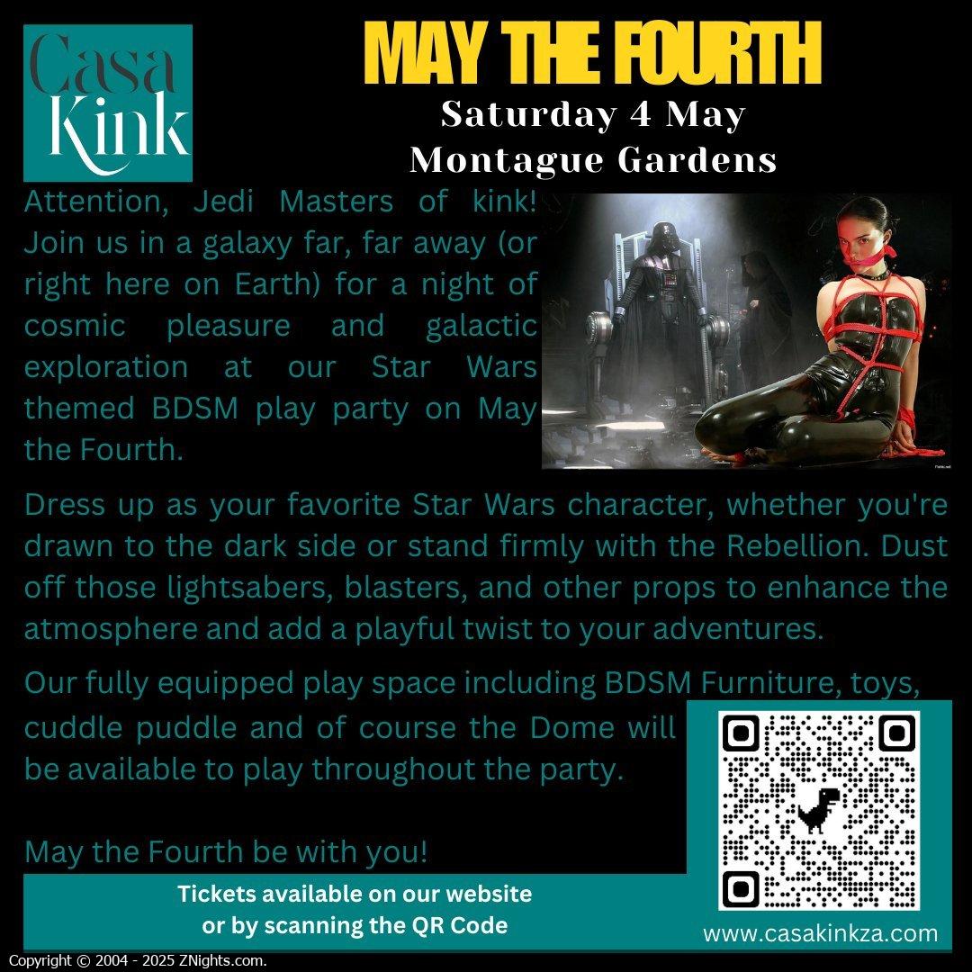A kinky Star Wars play event - Attention, intergalactic adventurers and Jedi Masters of kink! Join us in a galaxy far, far away (or right here on Earth) for a night of cosmic pleasure and galactic exploration at our Star Wars themed BDSM play party on May the Fourth.
