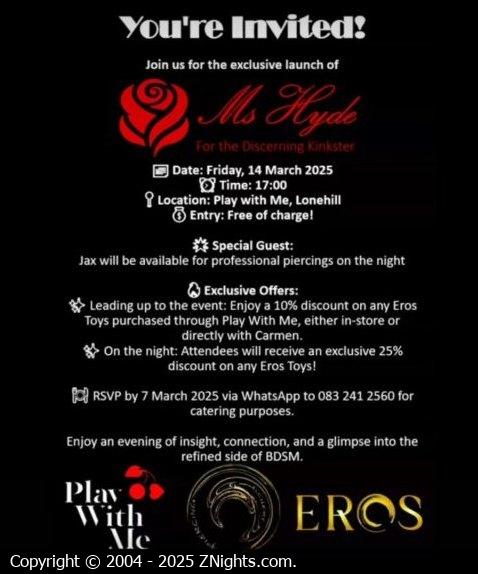 First 50 people attending will receive a goodie bag, and three lucky guests will find a Vibrating Cockring valued at R545 inside, thanks to Play With Me and Eros!