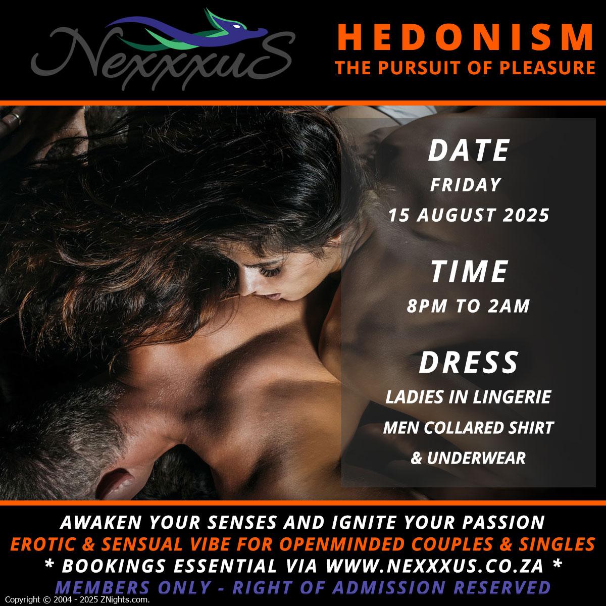 At Nexxxus Hedonism Nights we turn up the intensity with soft sexy lighting and sultry music, so come dressed to impress and undress to express. The vibe is erotic, the atmosphere is sensual, and the people are open-minded.